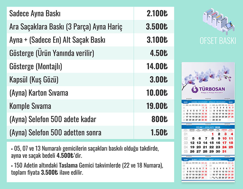 • Takvim Ebat: 31 x 69,5 cm